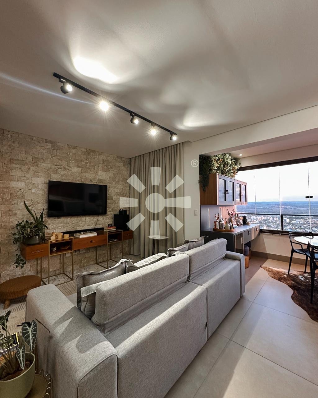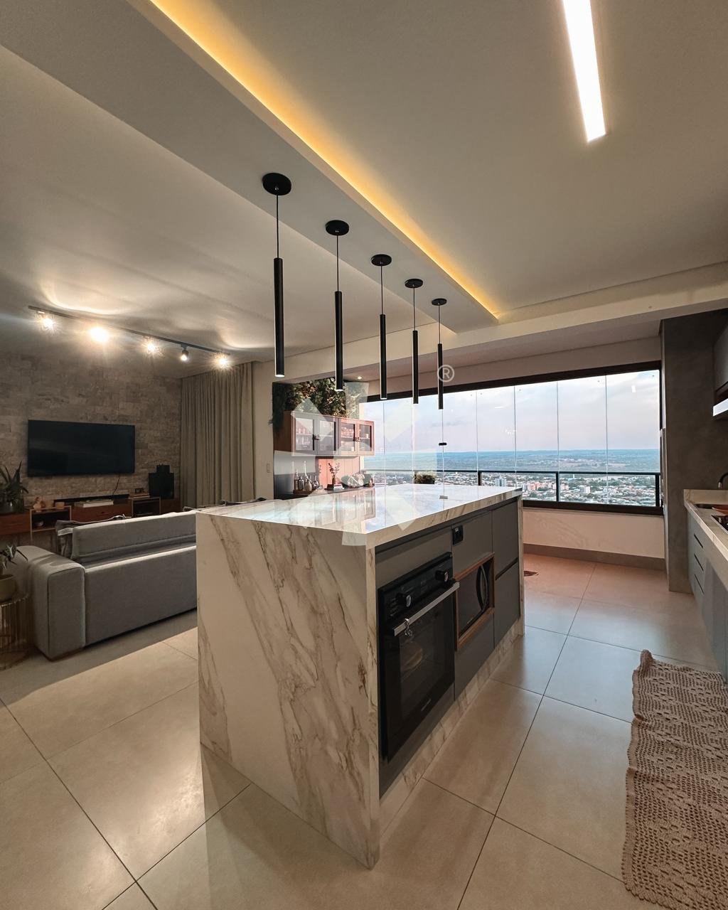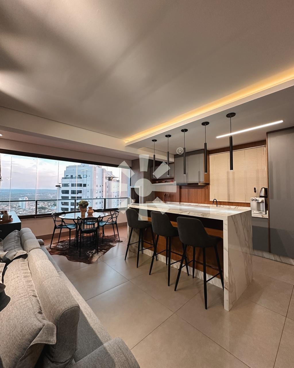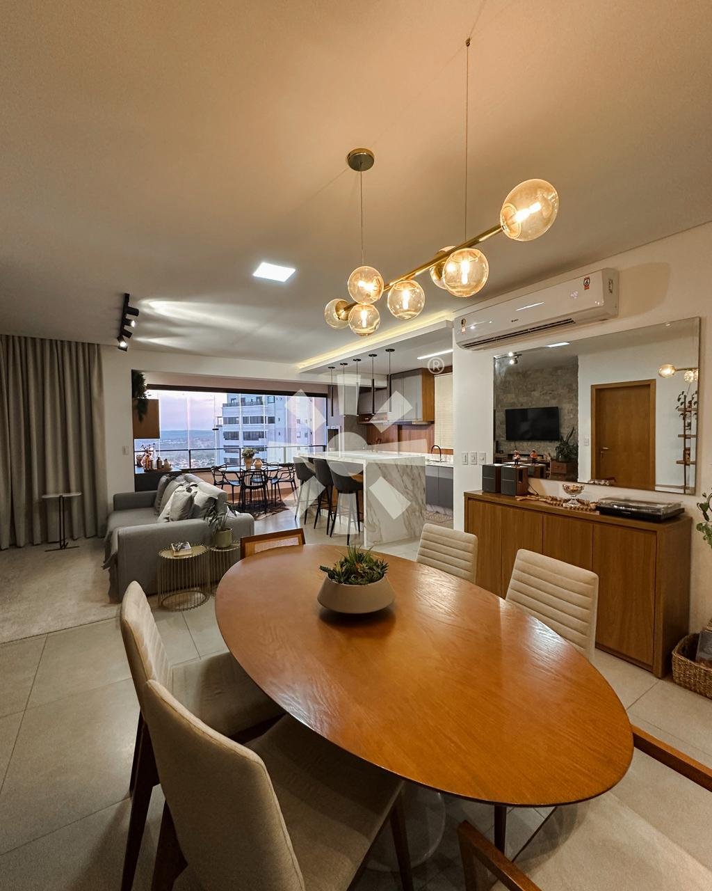 Ambientes integrados que conversam, móveis contemporâneos e climatização em todos os ambientes. Permanecem no apartamento: televisores, home theater, adega, geladeira, forno, coifa, cooktop, camas, mesas, cadeiras, cortinas e móveis planejados.
