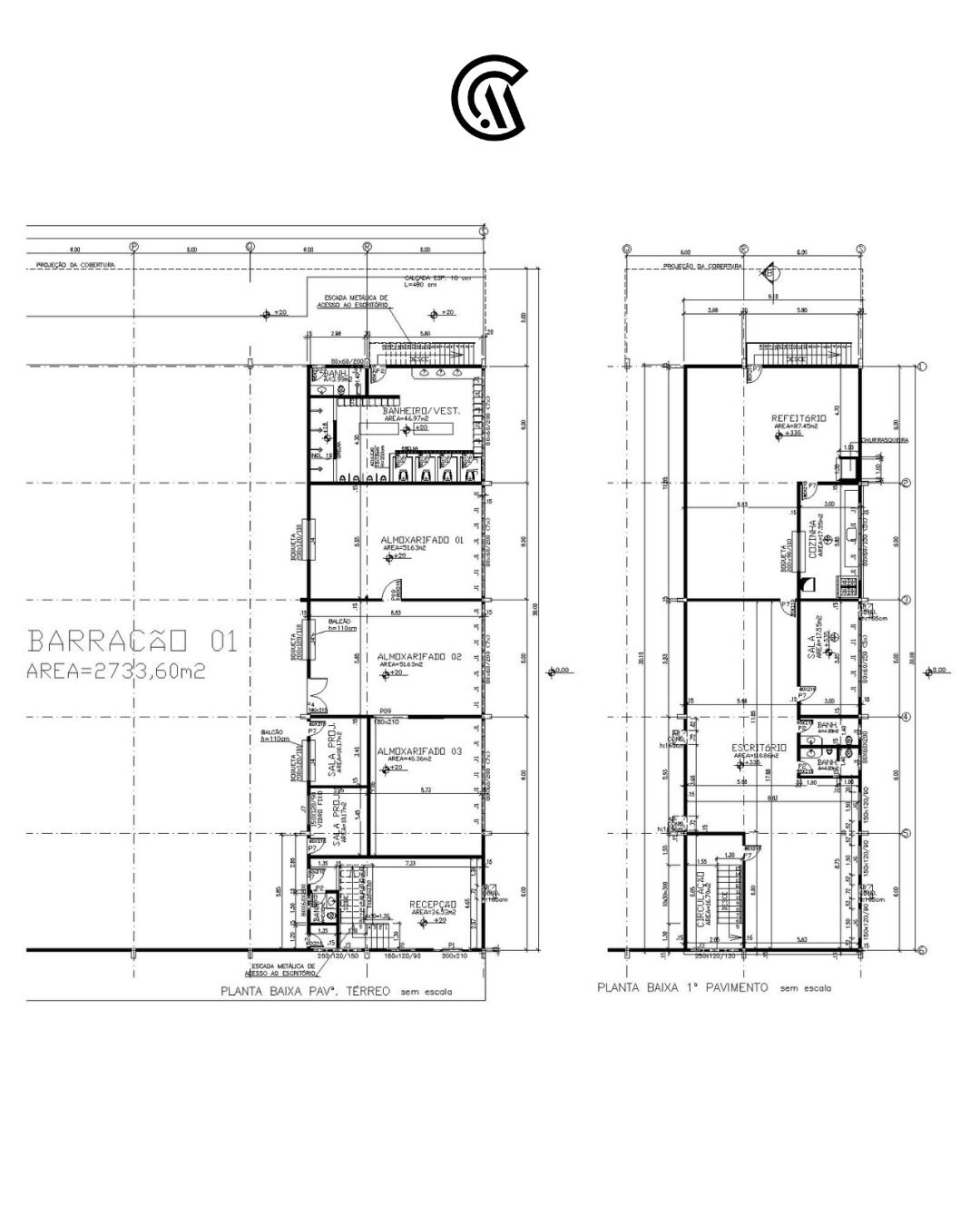 Área administração térreo: 270,00 m² (Recepção, banheiro, três almoxarifados, vestiário masculino e banheiro feminino)