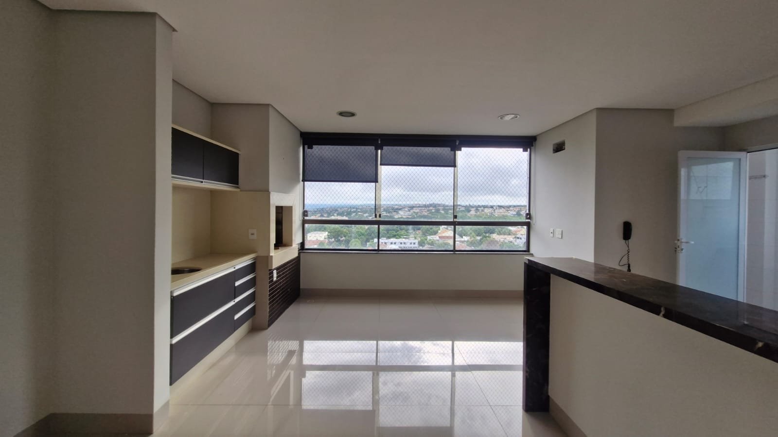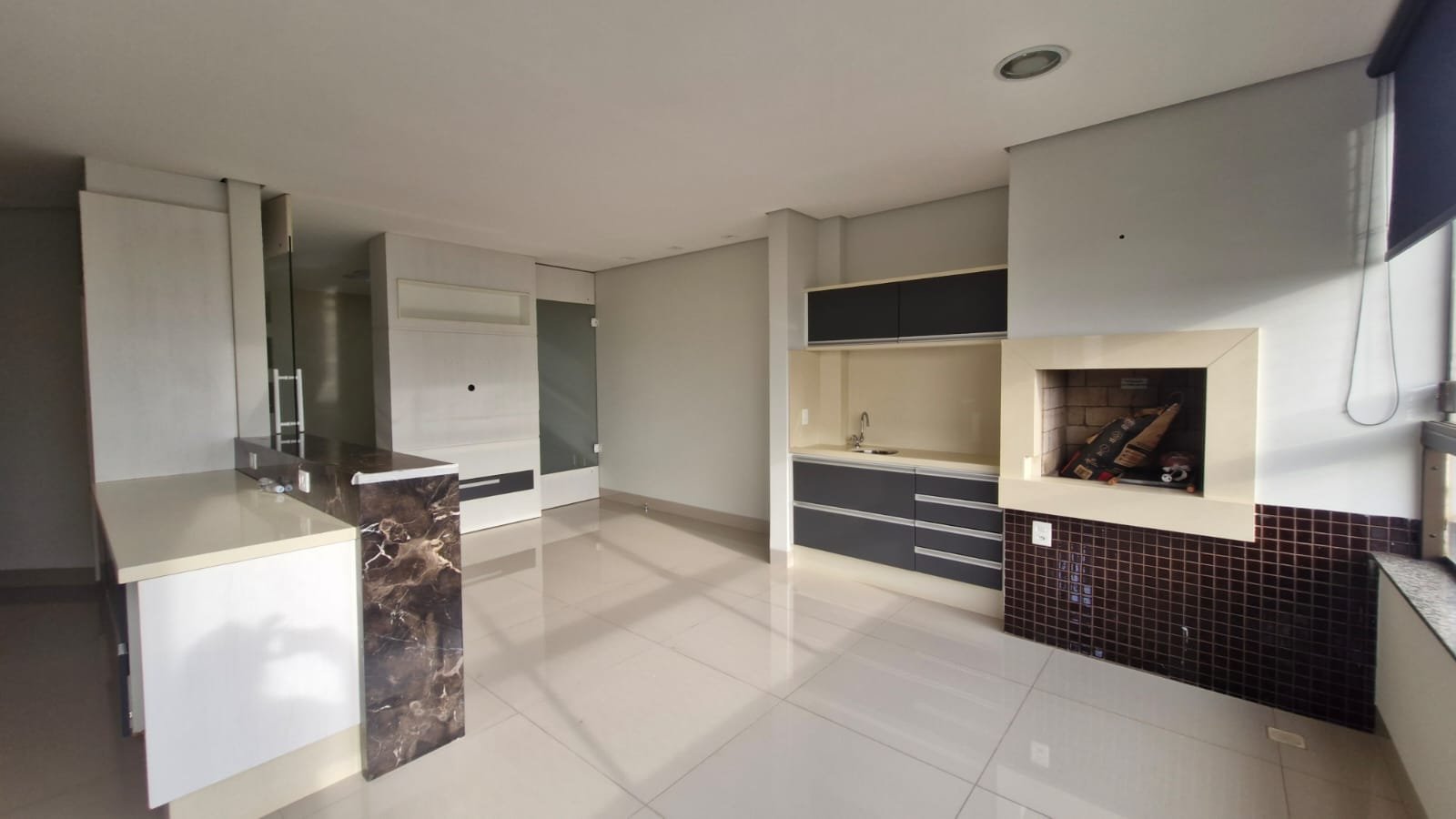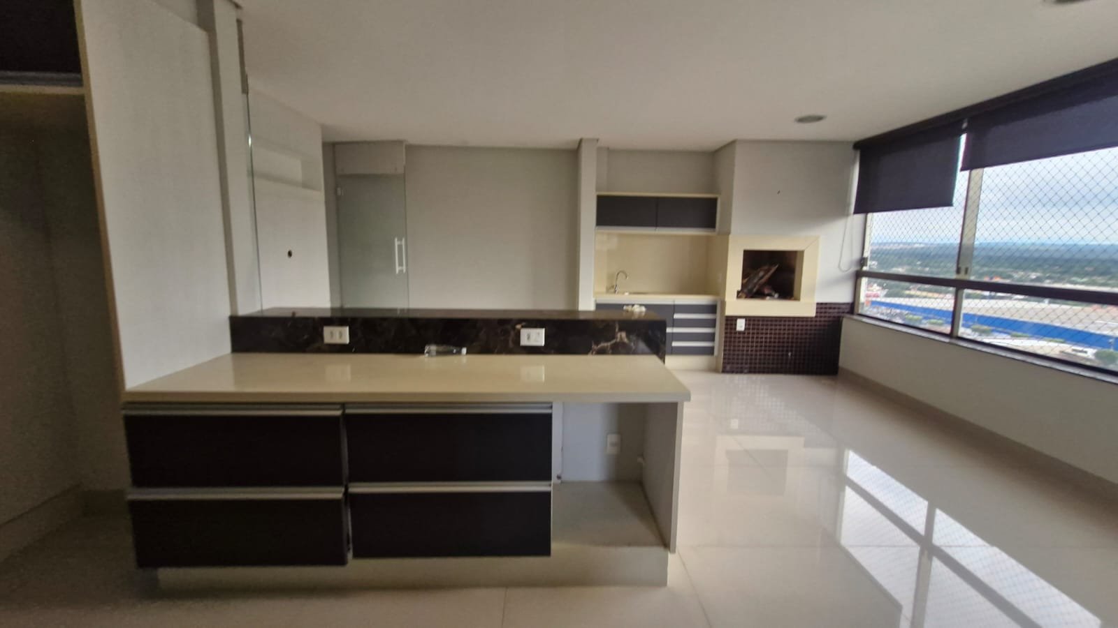 Cozinha com armários e integrada com a sacada com churrasqueira, planejados e cortina