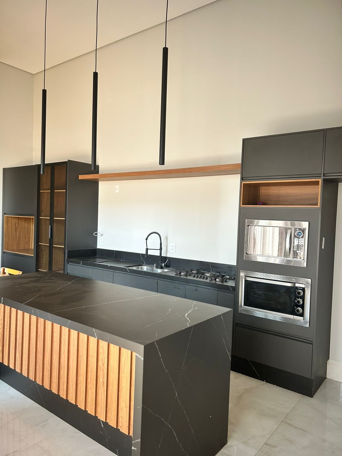 •Cozinha Gourmet toda mobiliada, com microondas, forno, mesa, cadeiras e fogão.